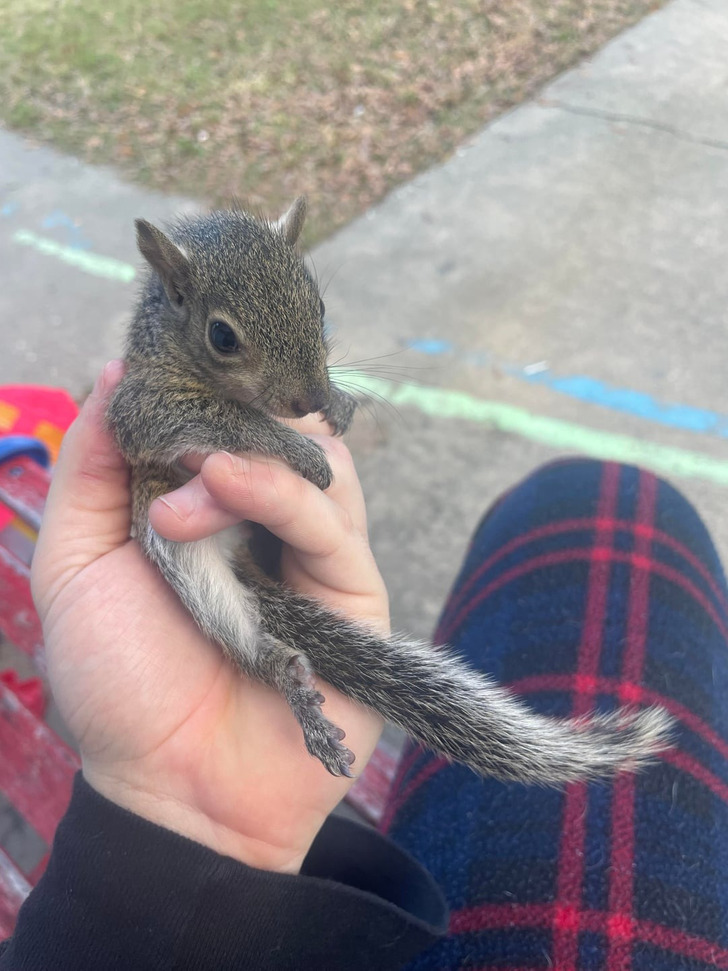 Не знаю возраст этого малыша. Кажется, ему уже несколько недель, но по сравнению со взрослой белкой он очень маленький. Я нашел его у себя во дворе. Он довольно неуклюж и, похоже, с трудом прыгает по деревьям.
