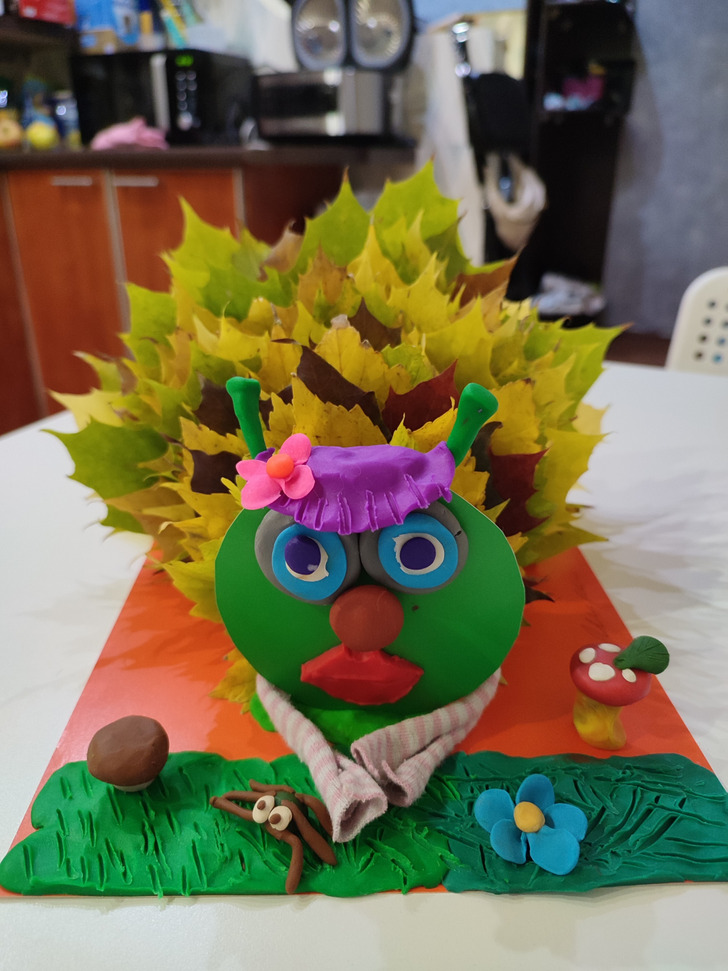 «На днях все принесли в сад осенние поделки. Мы с сыном пришли с гусеницей Олесей: я помогала искать кленовые листья и циркулем круг чертила, а он вырезал»