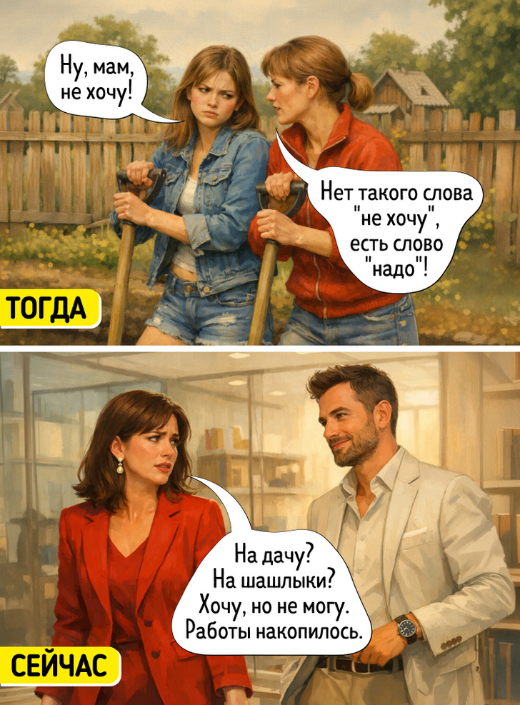 Знакомо? Не нравится домашка — все равно делай. Не нравится мыть посуду — все равно мой. Не хочется в грядках на даче копаться — угу, есть такое слово «надо». А где же свобода выбора?! А свобода в том, что взрослая жизнь на 80% состоит из дел, которые не вызывают восторга и восхищения, но обязательны для нашего же успеха и, как следствие, комфорта. Счета нужно оплачивать независимо от настроения. Отчеты нужно сдавать в срок, даже если не хочется. Здоровье требует регулярных действий — спорта, правильного питания, профилактических осмотров — независимо от того, нравится вам это или нет. Психологические исследования показывают: люди, которые способны делать необходимое независимо от сиюминутного желания, достигают целей в разы чаще, чем те, кто действует только «по вдохновению». Те, кто научился делать скучное и неприятное без внутренней драмы, быстрее получают доступ к интересному, потому что рутинные задачи не накапливаются, не блокируют прогресс и не съедают энергию. Родители учили нас одному из ключевых навыков успешной жизни — способности действовать вне зависимости от эмоционального состояния.