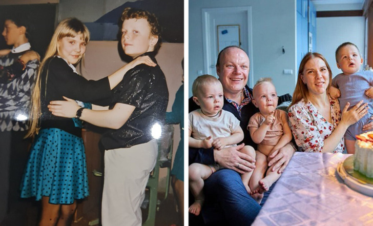 «На первом фото нам по 10 лет. А сейчас мы уже 10 лет официально женаты и растим тройняшек!»