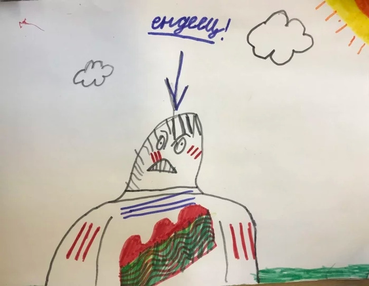 «Это уже не просто мой школьный рисунок, а мем⁠. Грозный вид выдает серьезные намерения индейца, но подпись делает рисунок незабываемым!»