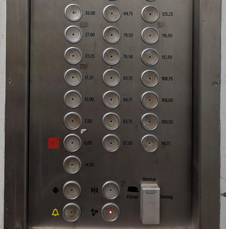 В этом немецком лифте вместо номеров этажей на кнопках указана их высота от земли