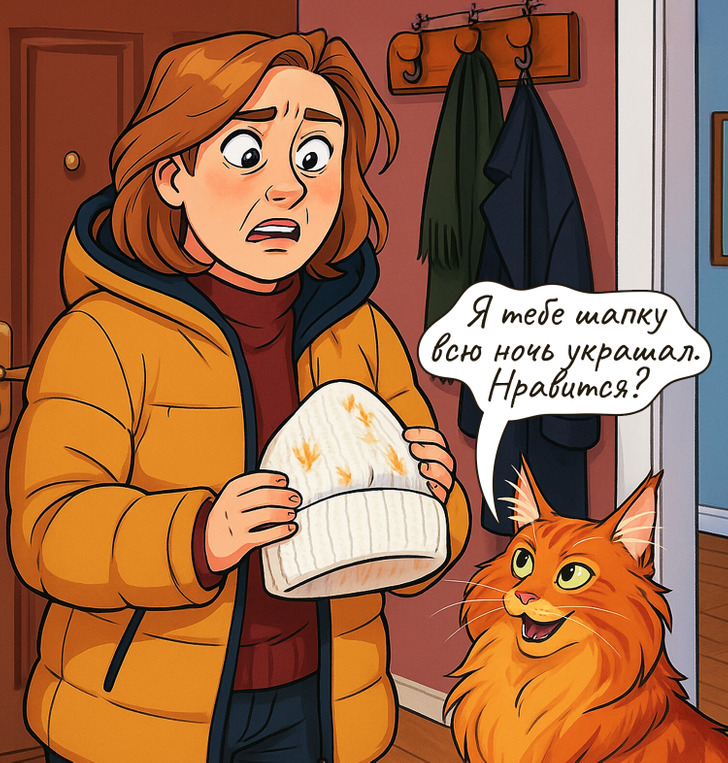 Он спал на шапке, а судя по хозяйке, она и себя то не вычесывает, не то что кота