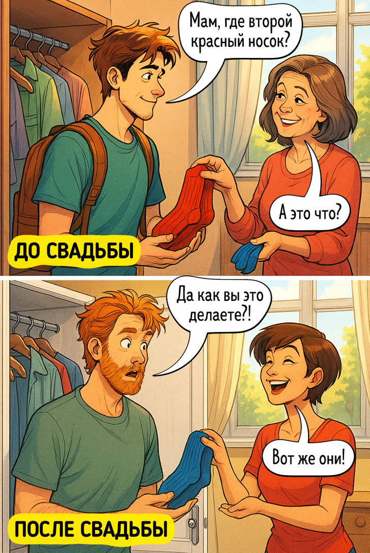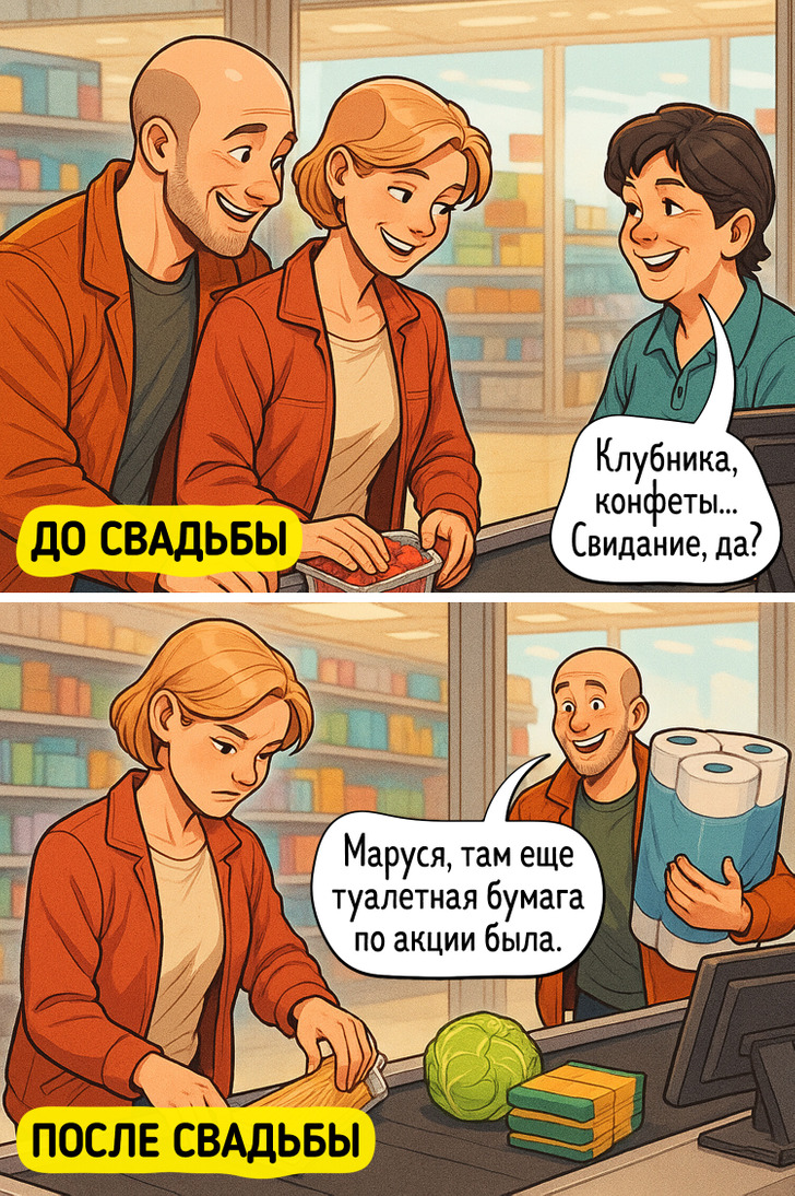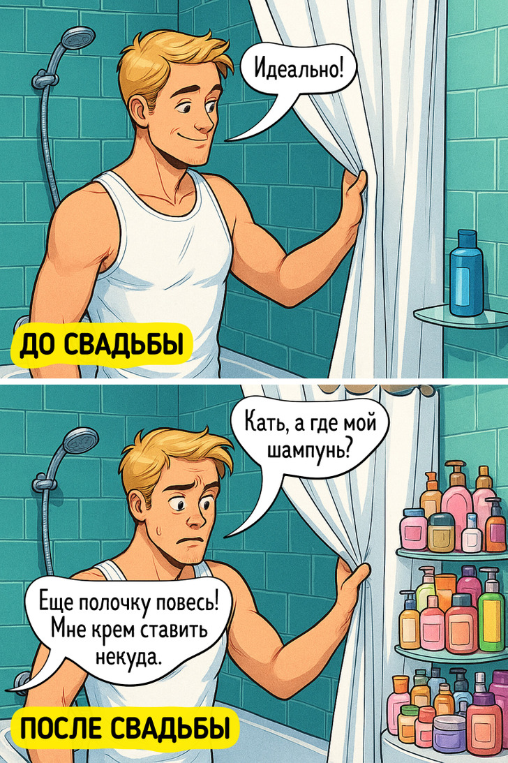 Помните, как все было до обмена кольцами? Цветы, кино, разговоры до утра и прочая романтика. А потом началась совсем другая история: то носки не на месте, то кто-то увел из-под носа любимую бритву и теперь считает ее своей. Но, пожалуй, именно так и рождается настоящая близость. Эти комиксы — о том, что любовь после свадьбы не теряет свою силу, просто она становится чуть более домашней.