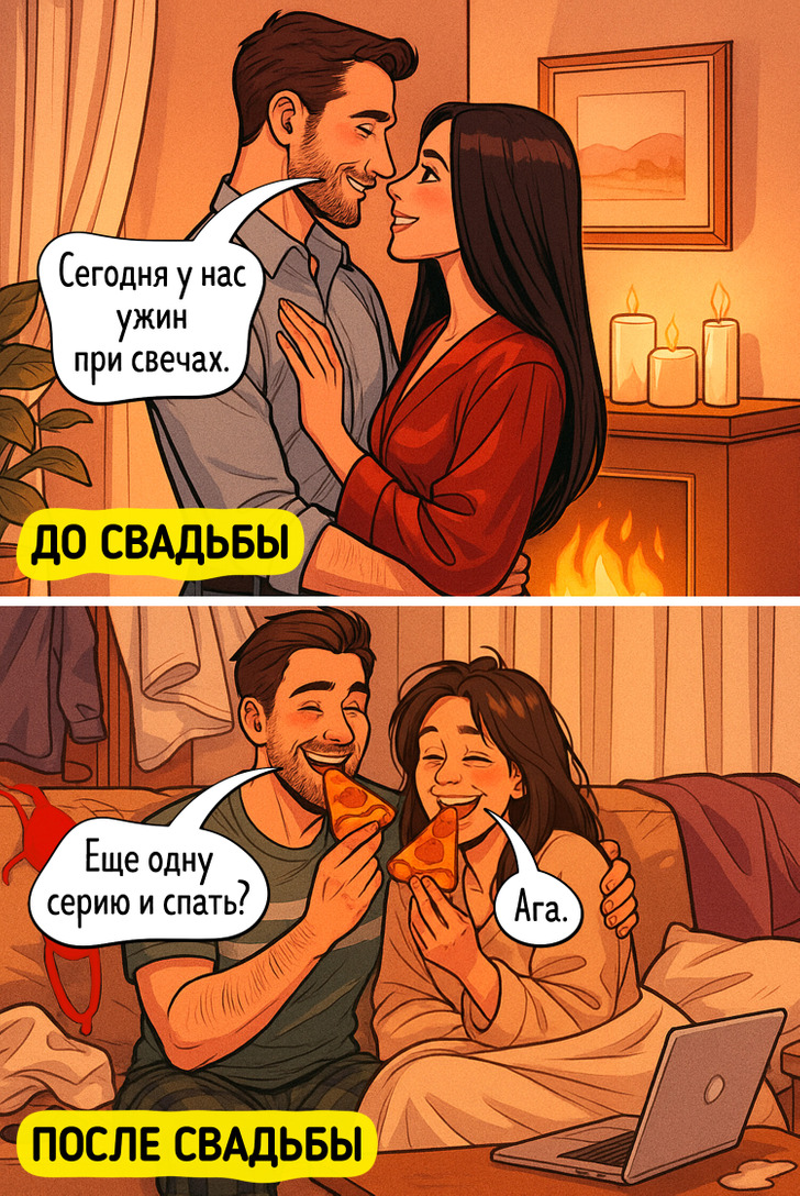 17 ироничных комиксов о том, как меняются отношения после свадьбы