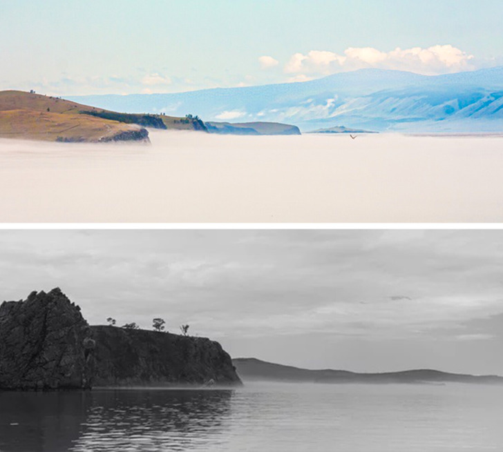 «Приезжаю на остров Ольхон на Байкале уже по темноте, идет ливень. Утром просыпаюсь — солнце. Иду наконец-то полюбоваться озером, а его нет! На втором фото туман уже развеялся»