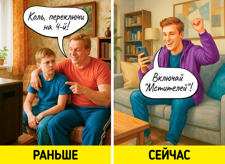 Старшему поколению порой кажется, что молодые люди чуть ли не пришельцы с других планет. Говорят на каком-то своем языке, одеваются странно, да и ко многим вещам относятся совсем по-другому. Что не удивительно, ведь мир все время меняется, а мы вместе с ним. Правда, с разной скоростью. Мы попытались придумать ситуации, где разница между бумерами и зумерами видна ярче всего, и попросили нейросеть нарисовать об этом комиксы.