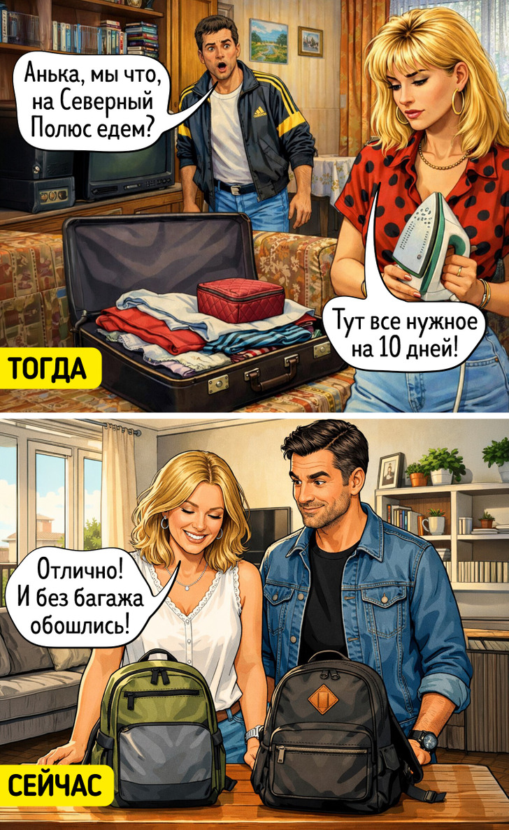 Загадка из начала 2000-х: как уместить в одном чемодане одежду на все случаи жизни, косметичку, аптечку, фен, утюг, так, чтобы еще и место на сувениры осталось? Хорошо, что теперь многие нужные штуки можно найти в отеле или просто купить