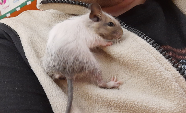Офигевшая и замерзшая, но крайне адекватная. Сразу залезла ко мне под воротник свитера и заснула. Я пообещала, что мы обязательно ее пристроим, и мужчина ушел. Крыса оказалась на редкость ручной, очень умной и контактной. Большую часть дня она провела со мной, а вечером присоединилась к моей веселой компании — котам, собаке и улитке. Сейчас Киса живет в большой клетке, спит у меня в капюшоне, я купаю ее в раковине специальным шампунем. Она держит в страхе котов, а собака все время пытается ее облизать. Всю жизнь мечтала о крысе, но у меня на них контактная аллергия. © Ukuliss / Pikabu