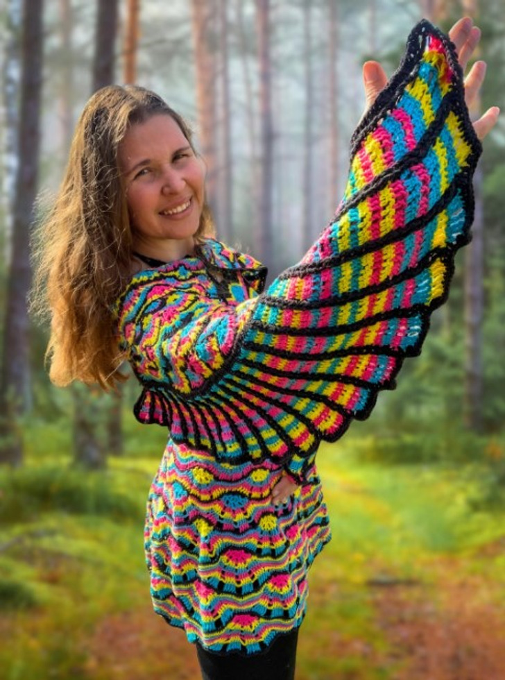 «Только что закончила эту вязаную крючком вещь. Это мой собственный дизайн»