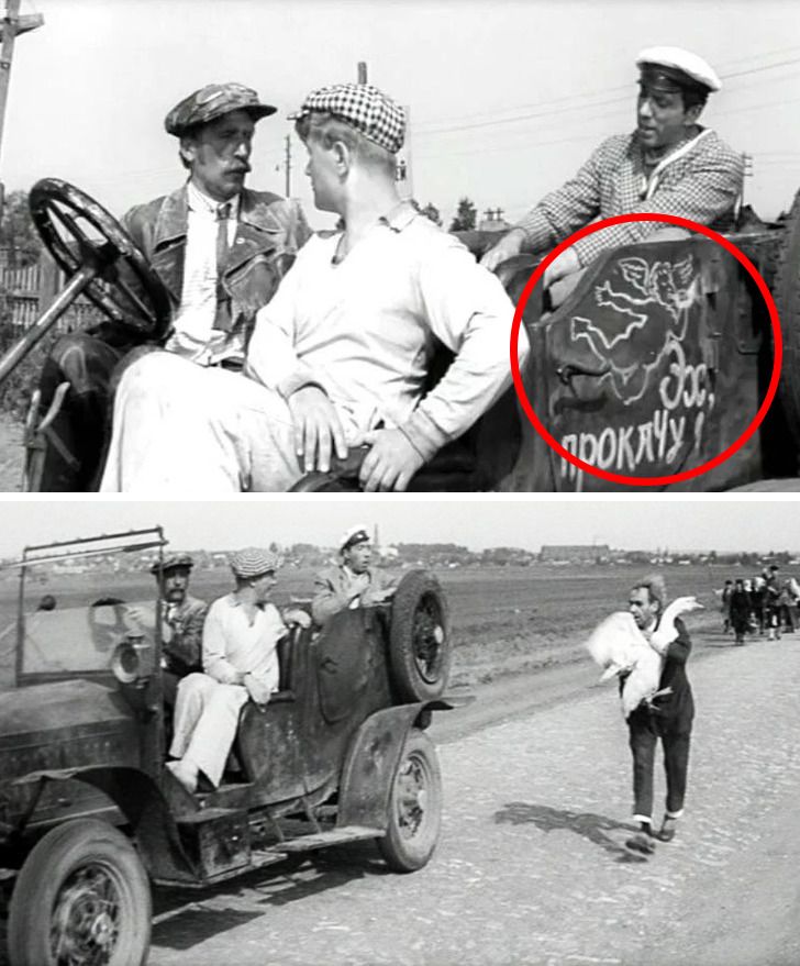 На борту автомобиля красуется надпись «Эх, прокачу!» и силуэт купидона. Но в одном из кадров и надпись, и рисунок внезапно пропадают.