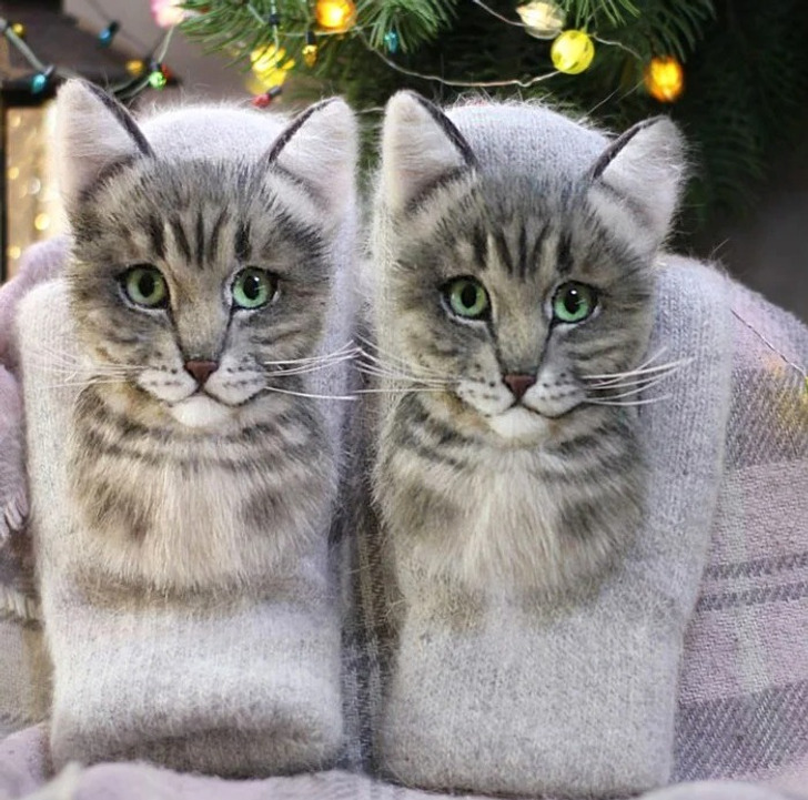 «Варежки выполнены по фото питомца. В работе использовался искусственный мех. Нос из полимерной глины, а усы из лески»