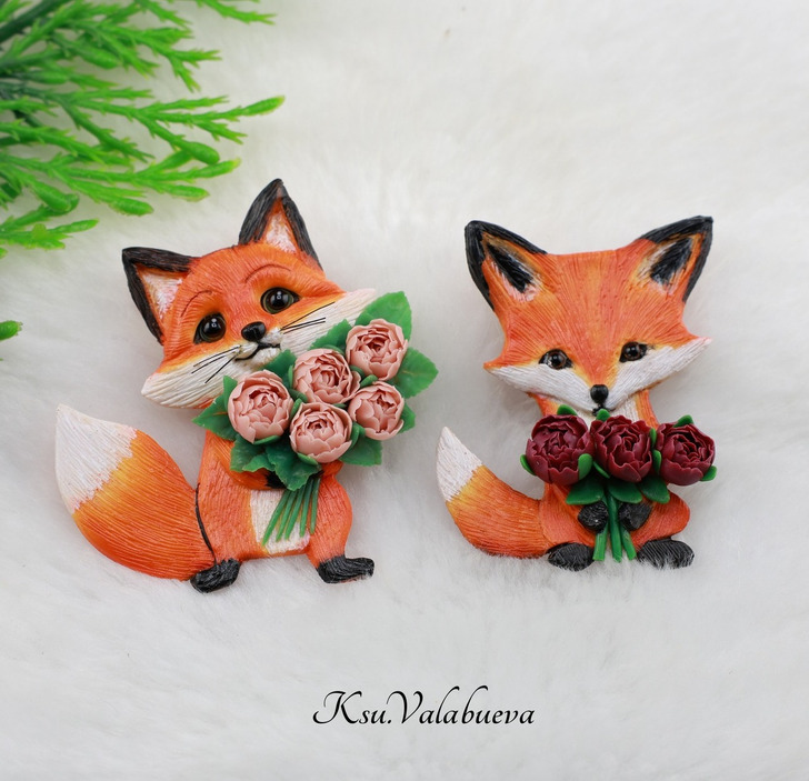 «Делюсь своими брошками из полимерной глины. Это милейшие лисички с букетами пионов. Все слеплено вручную»