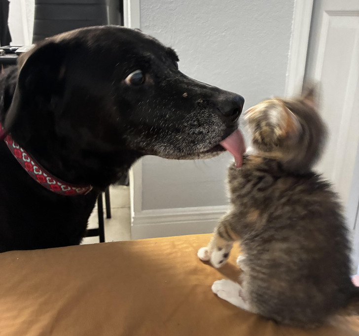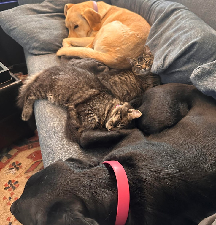 «У нас появились двое котят, которые тут же пришли в восторг от наших лабродоров и просто прилипли к ним»