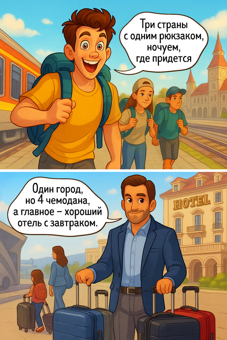 12. Мы в 16 лет думаем, что настоящий отпуск — это автостоп и ночевка в палатке. А в 35 ищем тур «Всё включено» и интересуемся наличием Wi-Fi.