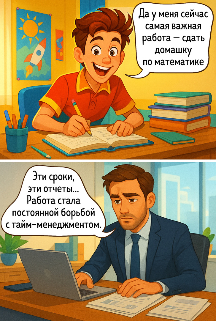 10. В 16 лет самое важное в жизни — успеть сдать домашку. А в 35 самое важное в жизни — успеть сдать отчеты и хоть чуть-чуть отдохнуть...