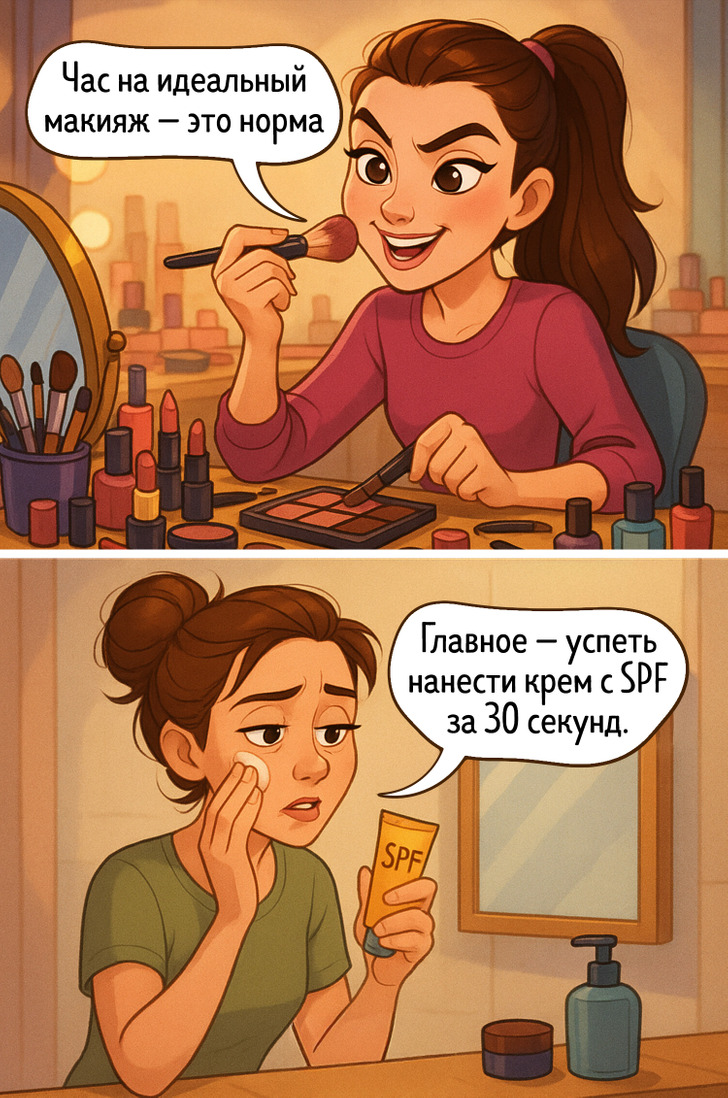 13. В 16 лет думаем, что час на идеальный макияж — это норма. А в 35 приходим к тому, что главное — успеть нанести крем с SPF за 30 секунд.
