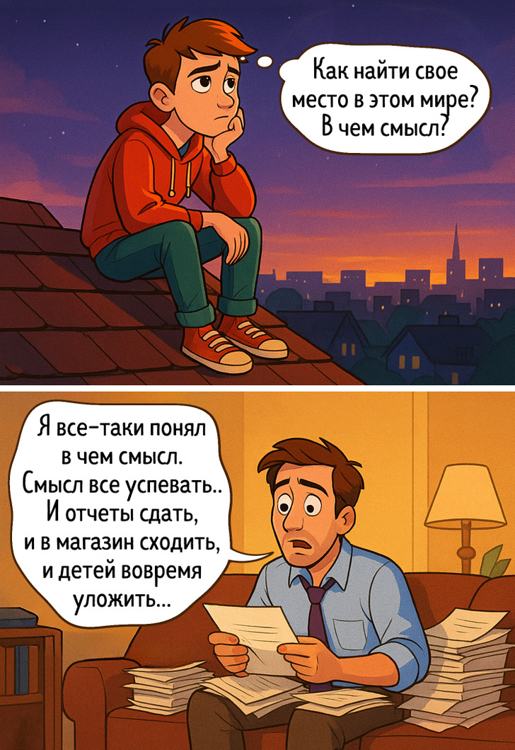 4. Мы в 16 лет думаем, что смысл жизни — это великий философский поиск. А в 35 смысл жизни — это успеть все по списку дел до того, как заснуть.