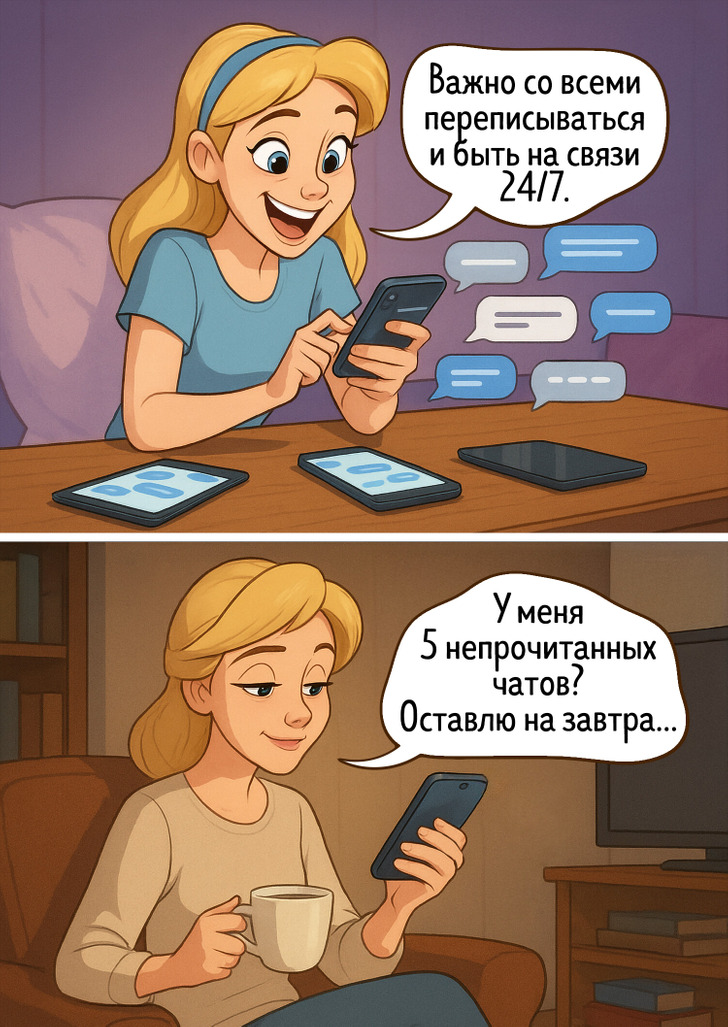 6. В 16 лет мы со всеми переписываемся и чуть ли не на связи 24/7. А в 35 думаем: «Что-то я уставшая сегодня. Отвечу утром»
