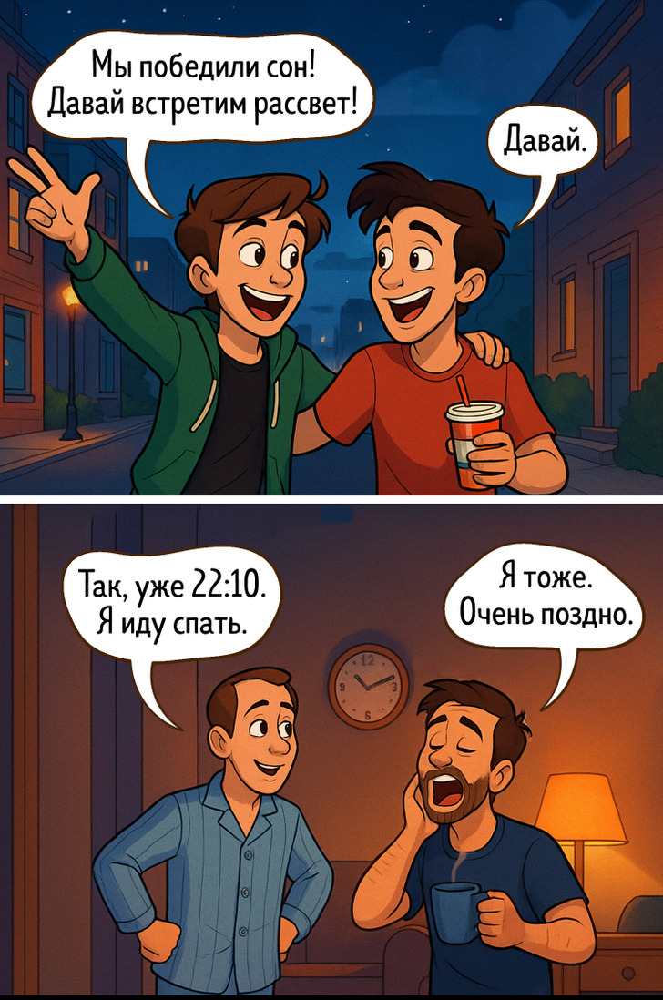 5. Мы в 16 лет думаем, что остаться бодрствовать до рассвета — это крутая победа. А в 35 большая победа — это лечь в 22:00, хотя вы собирались веселиться с друзьями до утра...