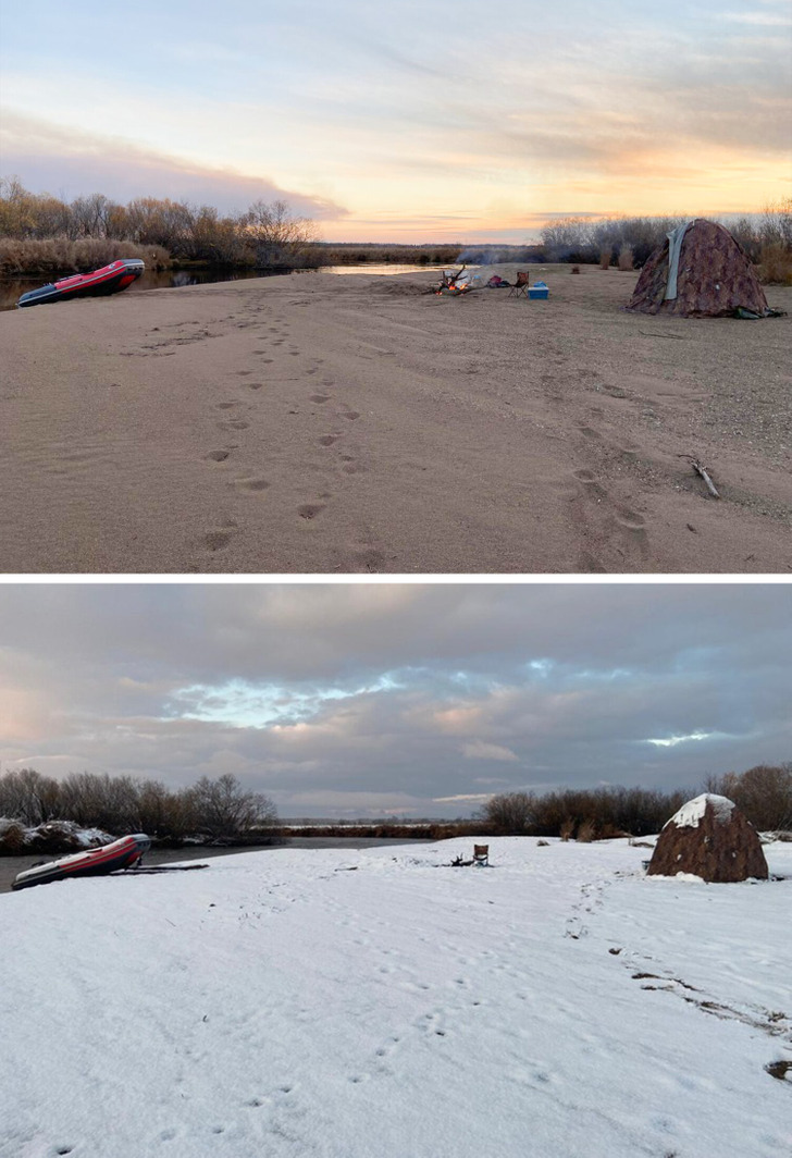 «Олень пересекает реку сегодня утром в Вайоминге. Снято, пока я лежал укутанный в кровати своего дома на колесах»