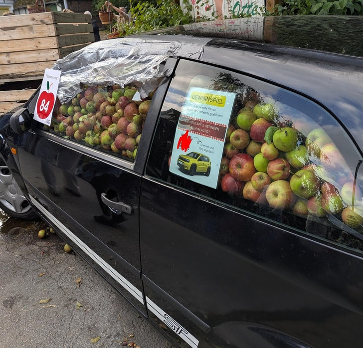 «На нашем местном деревенском фермерском фестивале вы можете угадать, сколько яблок находится в этой машине, и выиграть приз»