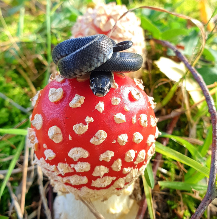 Зачем ужу гриб? Да и не уж это. Желтых пятен на голове нет.