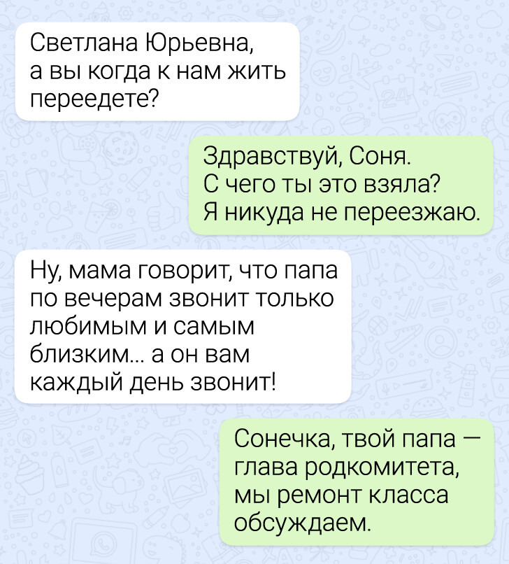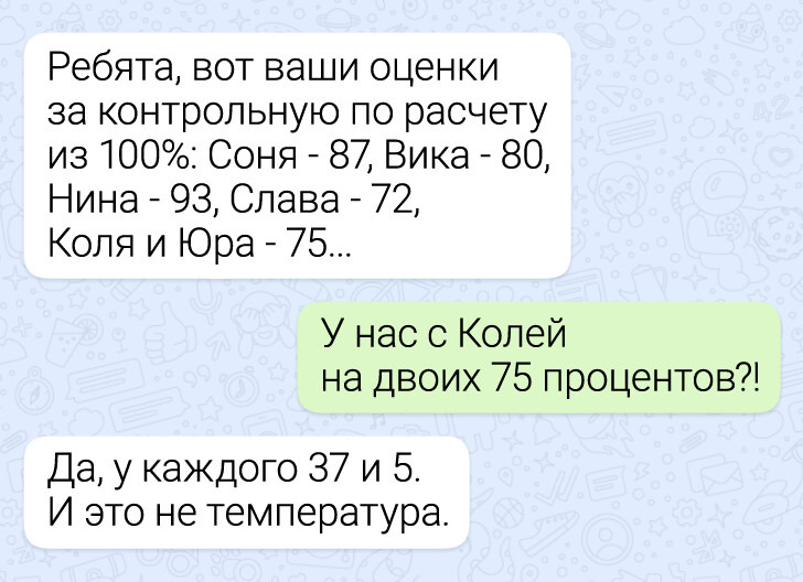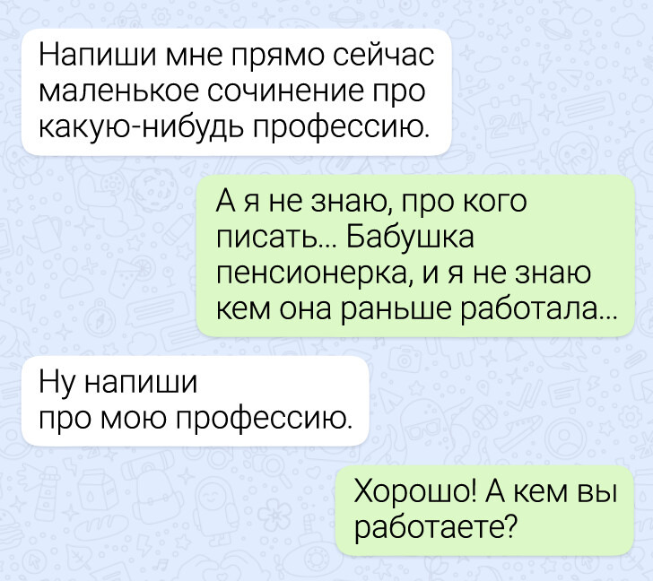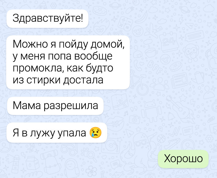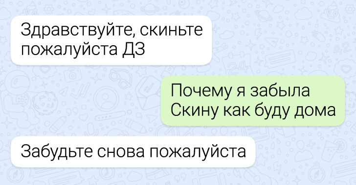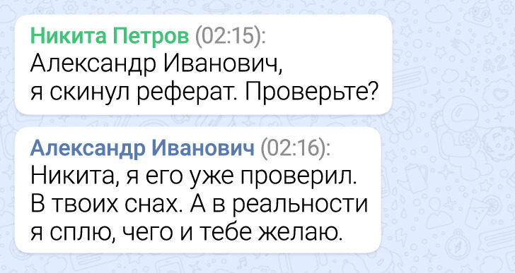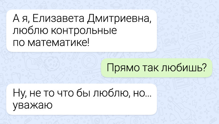 Учеба давно вышла за пределы классных кабинетов. Теперь вопросы по домашнему заданию, уточнения по контрольным и самые неожиданные просьбы нередко приходят учителям прямо в мессенджеры. И именно там иногда разворачиваются мини-сюжеты, которые по уровню комедии легко могли бы соперничать с хорошим ситкомом. Мы собрали несколько таких диалогов — в них и ученическая находчивость, и учительское терпение, и немало поводов посмеяться.