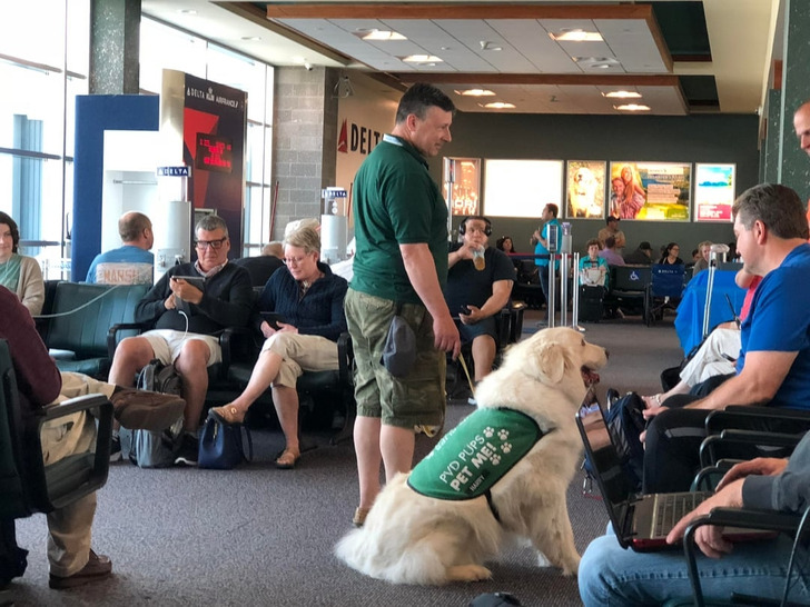 В некоторых аэропортах есть собаки эмоциональной поддержки, которых пассажиры могут гладить, чтобы снять тревогу перед полетом