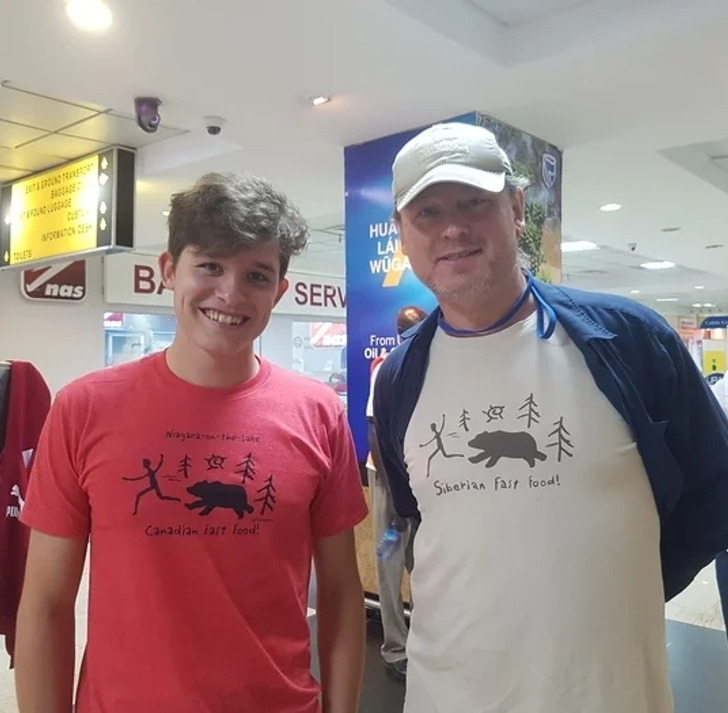 «Купил в Тюмени забавную футболку. Однажды в аэропорту Конго встретил парнишку в футболке с точно таким же рисунком, только я из Сибири, а он из Канады!»