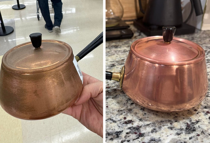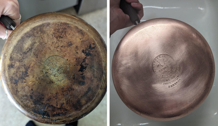 «Винтажный медный котелок до и после. Сначала пробовала уксус с солью, потом ту же смесь, но с мукой, потом сода+уксус+соль»