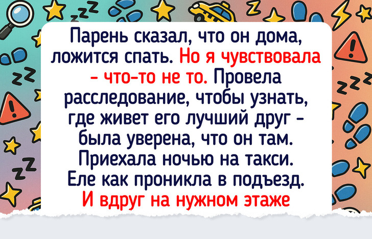 - Парень сказал, что он дома, ложится спать. Но я чувствовала — что-то не то. Провела расследование, чтобы узнать, где живет его лучший друг — была уверена, что он там. Приехала ночью на такси. Еле как проникла в подъезд. И вдруг на нужном этаже слышу музыку. Открываю дверь, а там он с какой-то девахой. © nastena_one