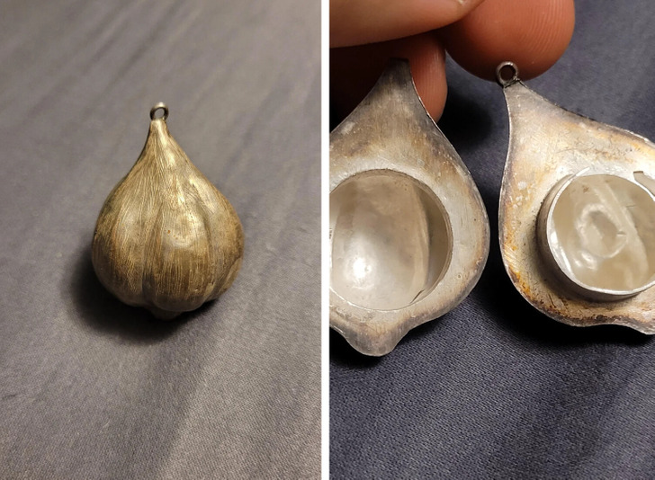 «Купила эту прелесть на распродаже. Мало того, что это буквально головка чеснока из серебра, так она еще и оказалась с секретом»