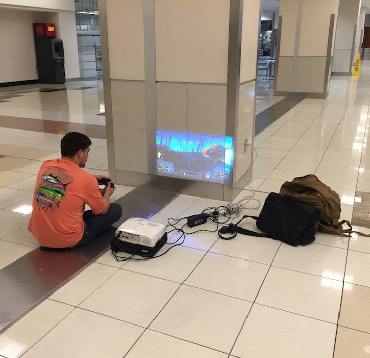 У парня, видимо, задержали рейс. Решил скоротать время. Да он просто гений!