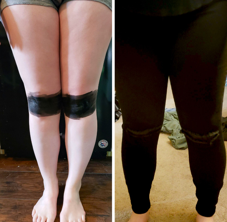 «На работе моей дочери разрешены только черные брюки, и никаких дырок. Ее обычная пара все еще в стирке, поэтому она решила схитрить. Как думаете, прокатит?»