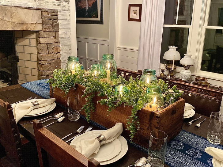 «Центральное украшение стола сделано из деревянного ящика для инструментов моего прадеда и стеклянных банок моей бабушки»