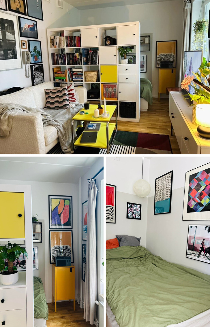 «Мои попытки создать комнату внутри комнаты. Я живу в крошечной студии, пришлось проявить изобретательность, чтобы она казалась просторнее»