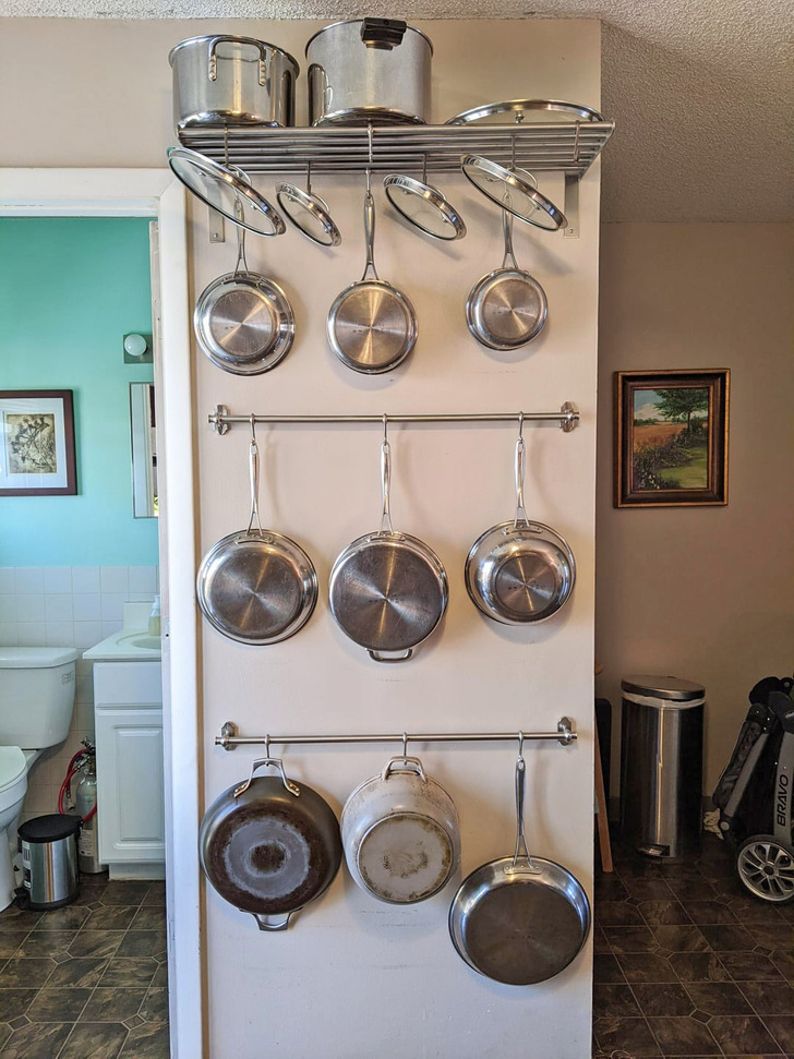 Мне, в принципе, нравится идея вывесить все сковородки и кастрюли, а не складировать их в шкафчиках на кухне. Но я бы придумала бы, как защитить эту стену от царапин и повреждений. Вот на это стене уже видны повреждения от трения.