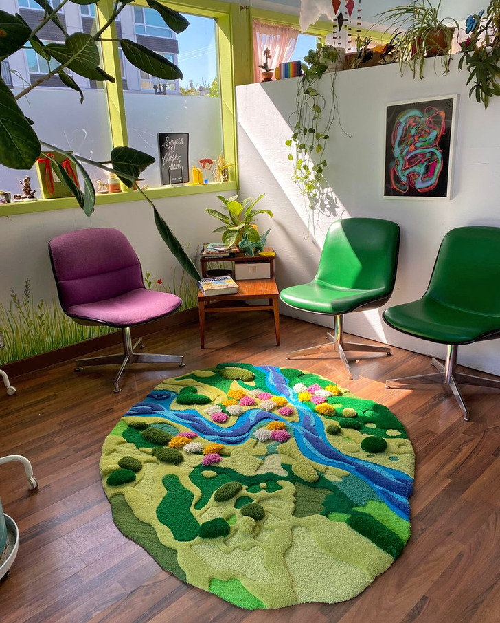 «Сделала коврик в виде мха! Он из акриловой и шерстяной пряжи, с комбинированным стриженым и петлевым ворсом разной глубины»