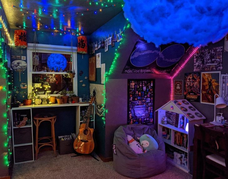 «Моя необычная спальня. Я сама сделала гирлянды в виде облаков. Мне кажется, здесь довольно расслабляющая атмосфера»