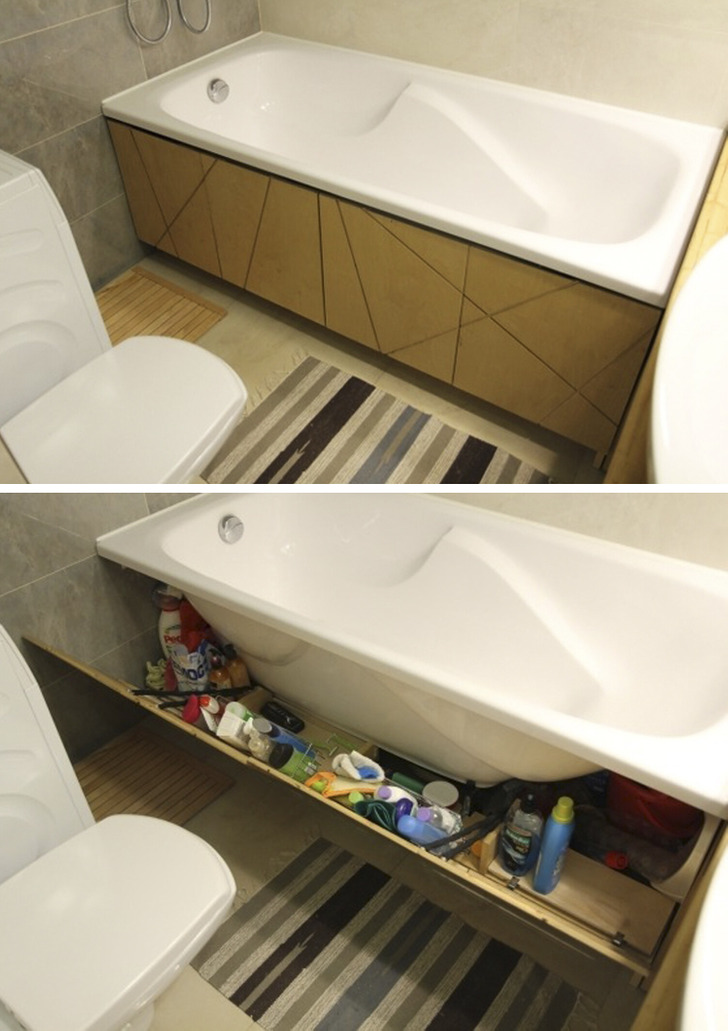 «Сделал вот такой экран под ванну из фанеры. Концепция не моя. Воплотил с учетом особенностей нашей ванны и наших потребностей в пространстве»