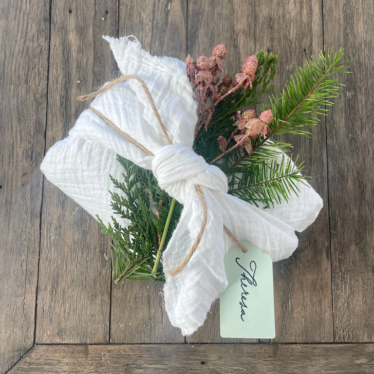 «Упаковка подарка с помощью ткани, шпагата и сосны»