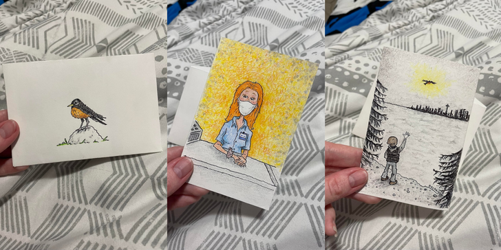 «В последний день на работе перед переездом постоянный клиент, которого я видела каждый день, подарил мне открытку, полностью нарисованную вручную»