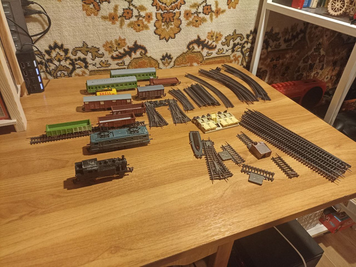 «Попала в руки игрушка из моего далекого детства. К сожалению, много чего повреждено, но рельсы целые, локомотивы и вагончики на ходу. Остальное починим»