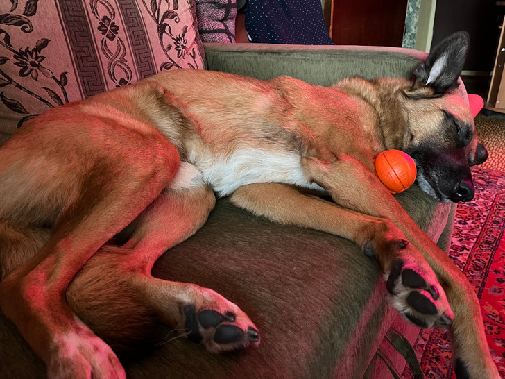 У него целая куча разных игрушек, штук 20, но любимым стал именно этот мячик, который я купил за 99 рублей. Вторая собака, младшая, на него вообще внимания не обращает, но ему почему то нравится именно он. Везде таскает, спит с ним. Никак в толк не возьму, чем он ему так понравился. 4 года уже с собой таскает, если едем куда, берем ему его с собой. © akimov121 / Pikabu