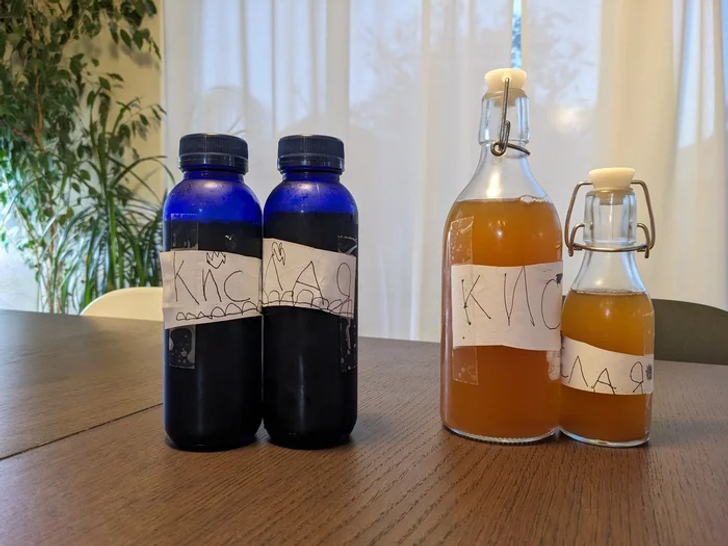 Мы делали все по классическому рецепту, а потом начали придумывать разные добавки: мяту, мед, имбирь, лимон и даже эхинацею! А потом случилось событие, перевернувшее историю семейного комбучного дела: черная заварка дома закончилась, и муж решил попробовать сделать комбучу на зеленом чае. Получилось просто улет! Даже без всяких добавок.