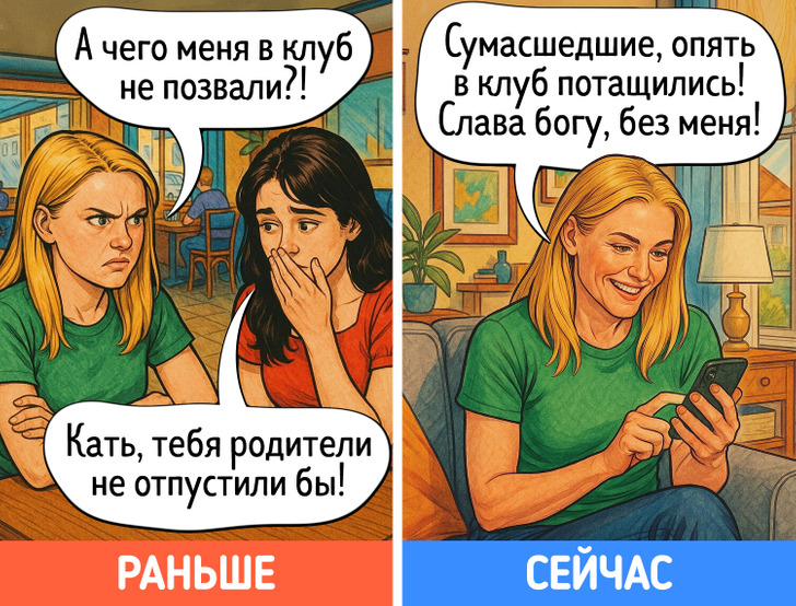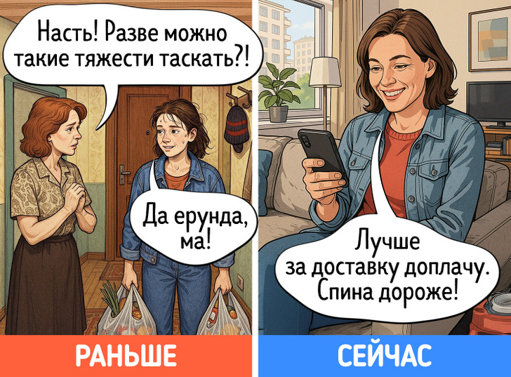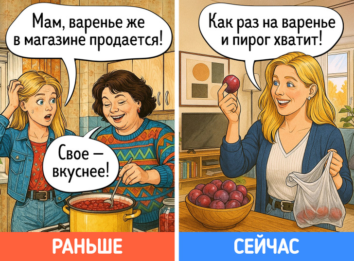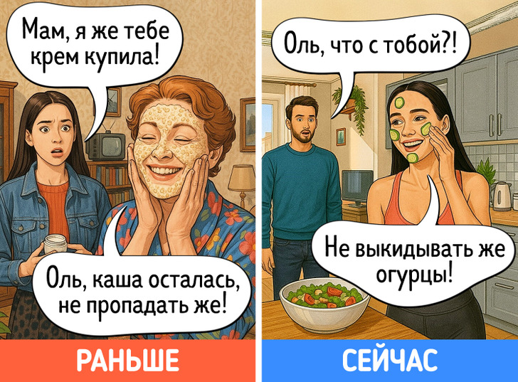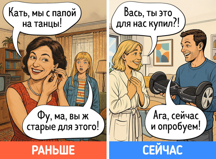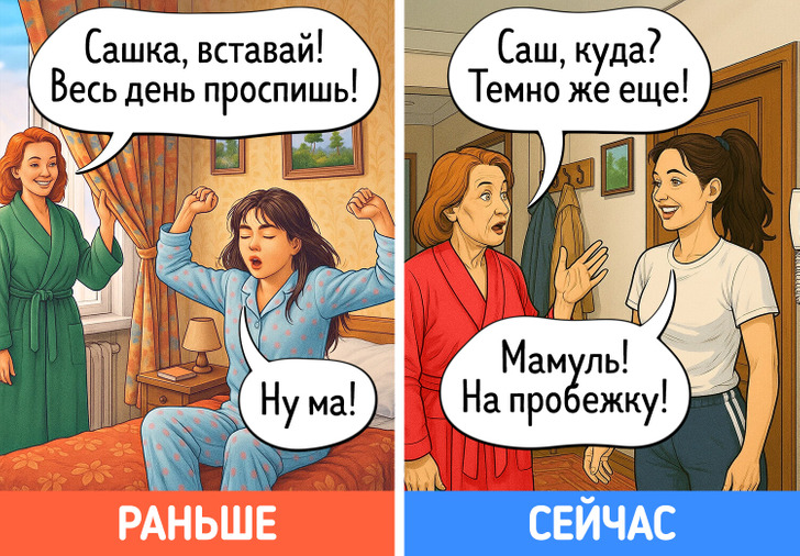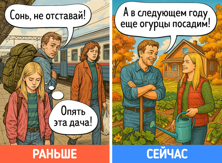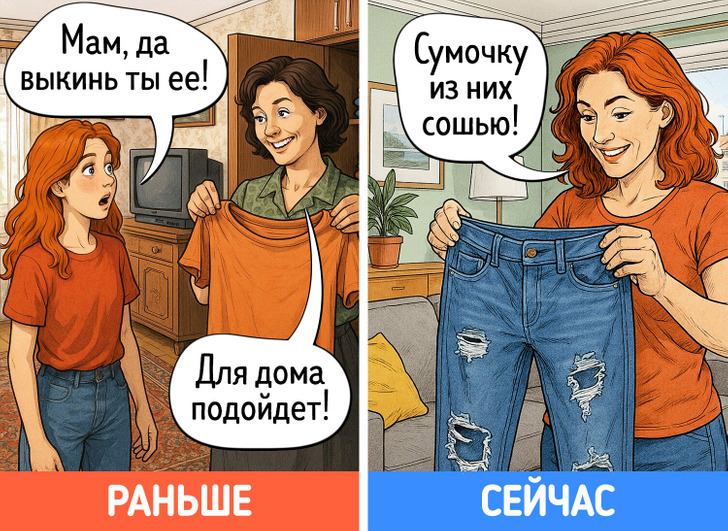 В юности многие идеи, которые старались донести до нас родители, казались сущей ерундой. Однако с годами начинаешь видеть их в новом свете. Дача вдруг становится любимым местом отдыха, на свет извлекаются бабушкины рецепты, а выкинуть старую одежду просто не поднимается рука. Мы попросили нейросеть нарисовать комиксы о том, как меняется наше отношение к родительским причудам после 40 лет.