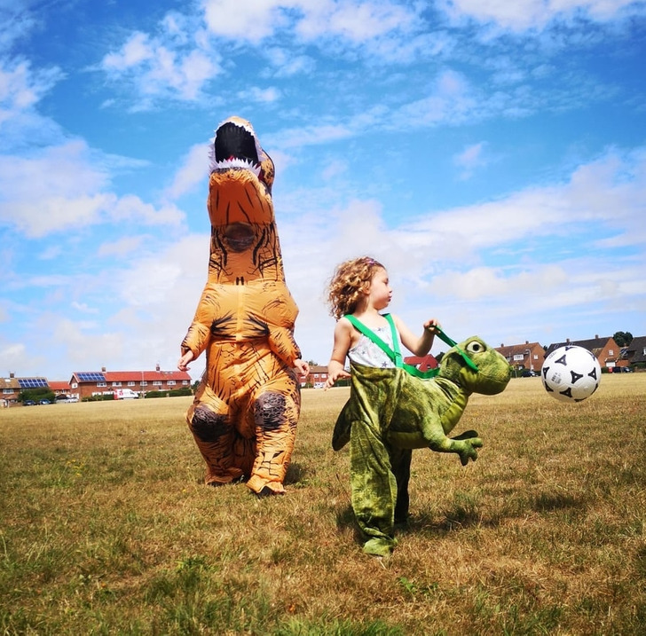 «Моя дочь и свекровь родились в один и тот же день. Сегодня они отмечали праздник в местном парке в костюмах динозавров — незабываемый день рождения!»