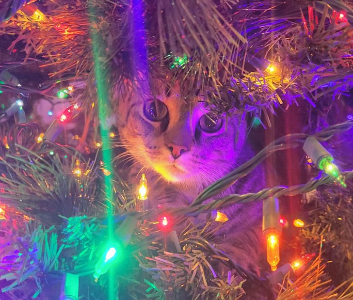 2. «Мой котейка впервые видит рождественскую елку. Я думаю, ему нравится»