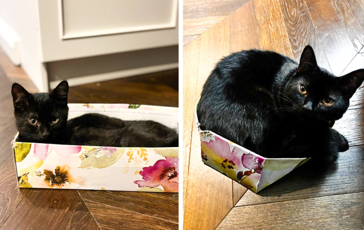 «Наш котик уже вырос из своей коробки, но все еще считает, что она ему как раз»